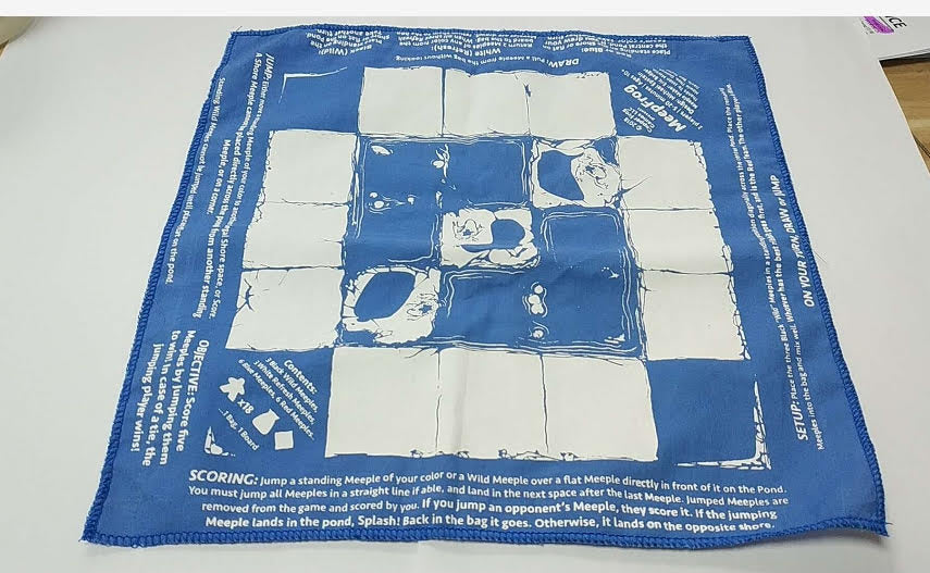 MeepFrog is an artisan-crafted microgame of leaping meeples on a pond for 2 players, featuring all cloth and hardwood pieces. No paper or cardboard is used for this game, even for the rules!
